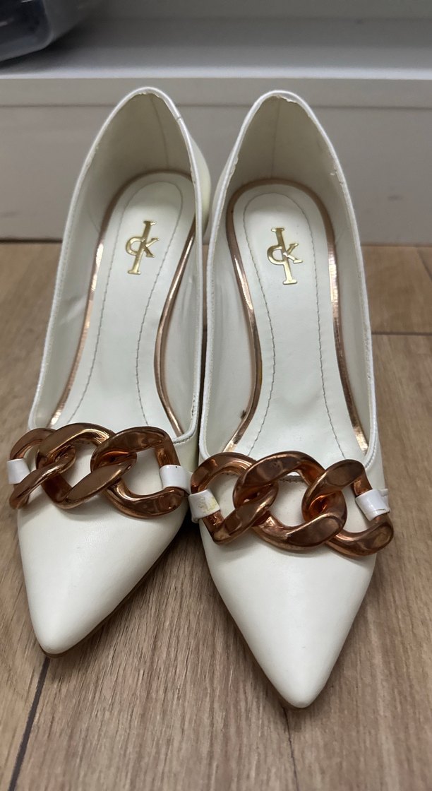 Beyaz, parlak ve zincir detaylı stiletto topuklu ayakkabı, ofis için modern klasik tarzda. Kauçuk malzemeden üretilmiştir. Sadece 1 kez nikahta giyildi.