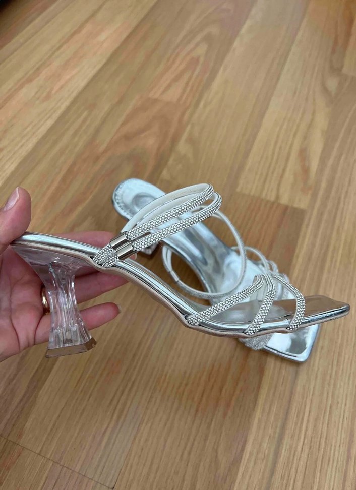Zarif beyaz ayakkabılar, parlak yılan deseni ve zincir detaylarıyla süslenmiştir. Şeffaf stiletto topuklu, düğünler için ideal. Ayarlanabilir bağcık