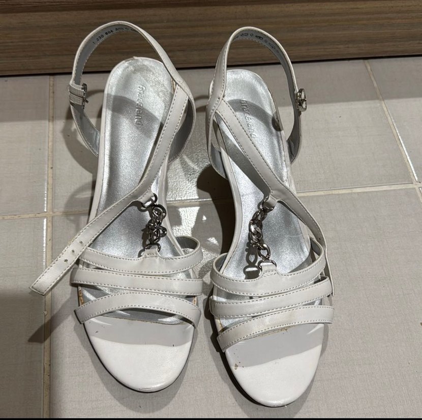 Beyaz renkte, zincir detaylı, topuklu sandalet. Kauçuk malzemeden üretilmiş, klasik şıklık için uygun. Çok az kullanılmış.Günlük işe de olur, gelinliğin altına da.Ayakta güzel duruyor, ihtiyaç fazlası.