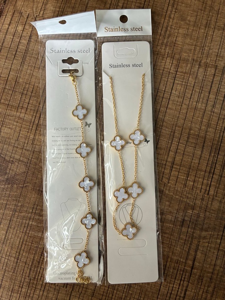 Beyaz renkli, zincir detaylı uzun kolye. Baskılı yonca desenleri ve paslanmaz çelik malzeme ile günlük kullanım için uygun, minimalist bohem tarzda.