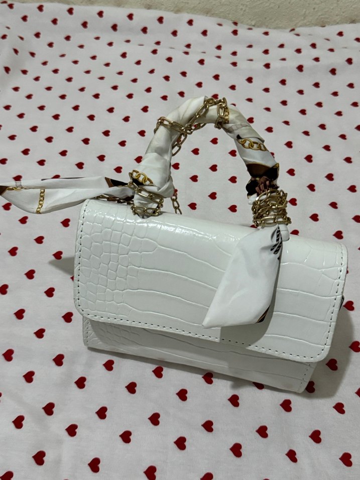 Beyaz Zincir Detaylı Yılan Derisi Desenli Fularlı Kadın Çanta
