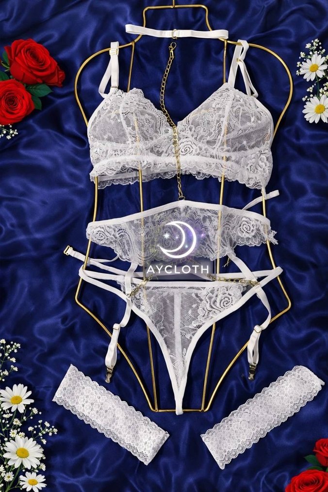 BEYAZ ZİNCİRLİ TAKIM Paket İçeriği ; Sütyen - Kemer - Slip - Bacaklıklar Bedenler ; S/M - L/XL Not ; Baleni ve desteği mevcut değildir. İç giyim ürünlerinde iade ve değişim yoktur.