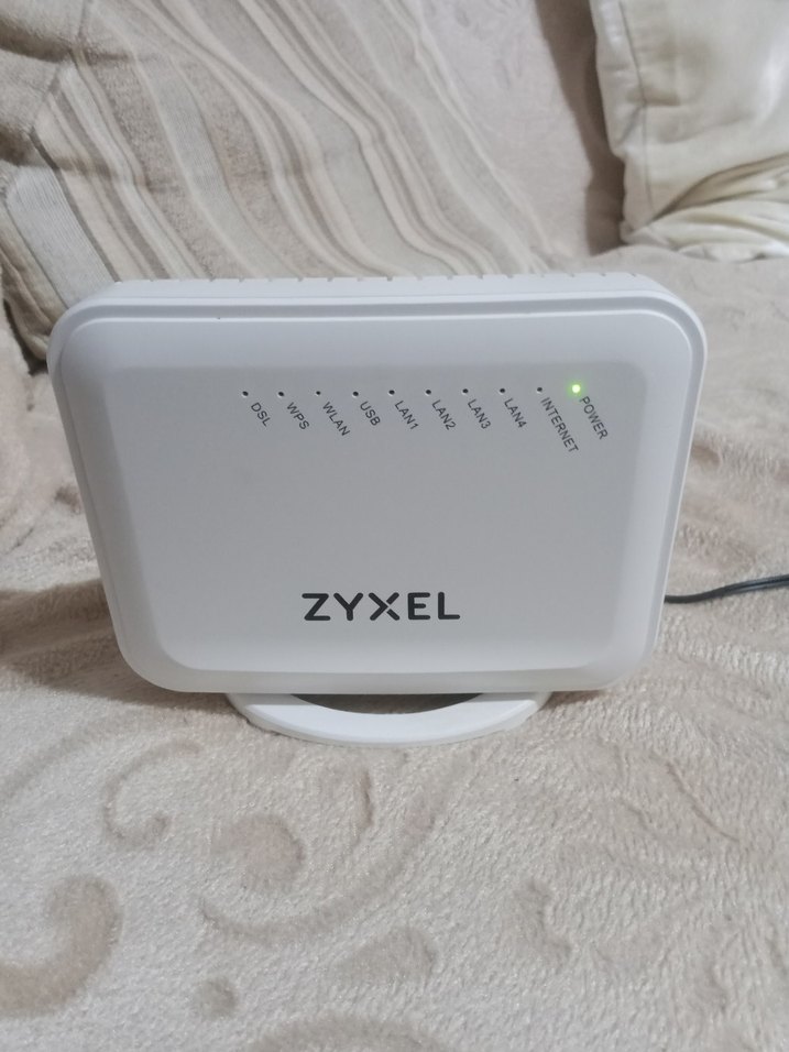 İnternet ve LAN durum göstergeleri bulunan beyaz Zyxel modem, ağ bağlantısı için tasarlanmıştır.