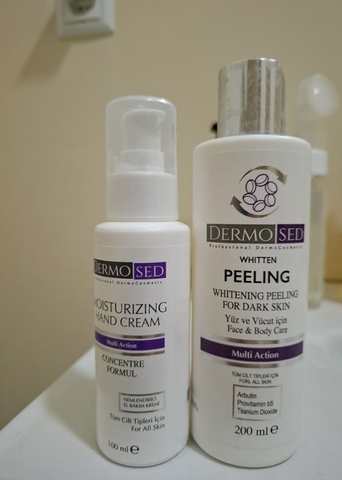 Beyazlatici nemlendirici krem ve peeling dermosed Krem 1 2 kez denendi Peeling yarısından fazlasi dolu Etkili urunler birlikte kullanilmasi önerilir #peeling #beyazlatici #farmasi