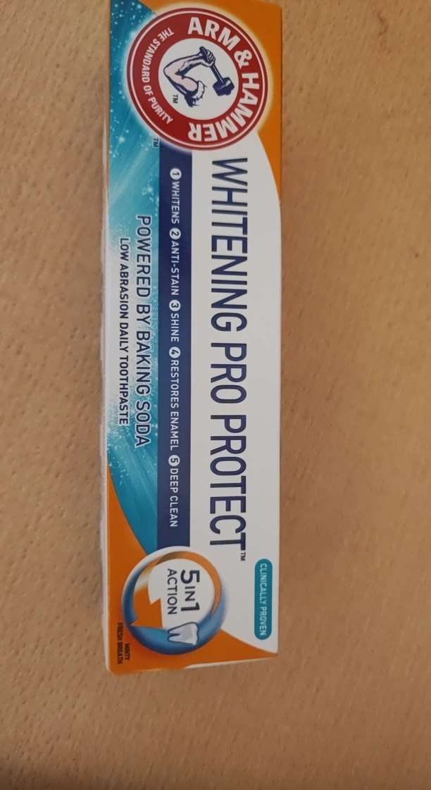 Beyazlatıcı Pro Koruyucu diş macunu, beyazlatma, leke önleme, parlaklık, mine onarımı ve derin temizlik özelliklerini 5in1 sunar. Arm& Hammer diş macunu Günlük kullanım için düşük aşındırıcıdır ve kabartma tozu içerir. Klinik olarak kanıtlanmıştır. Sıfır ve hiç kullanılmamıştır mükemmel kalite gerçekten kaçırmayın derim çok beyazlatır ve çok profesyonelce korur