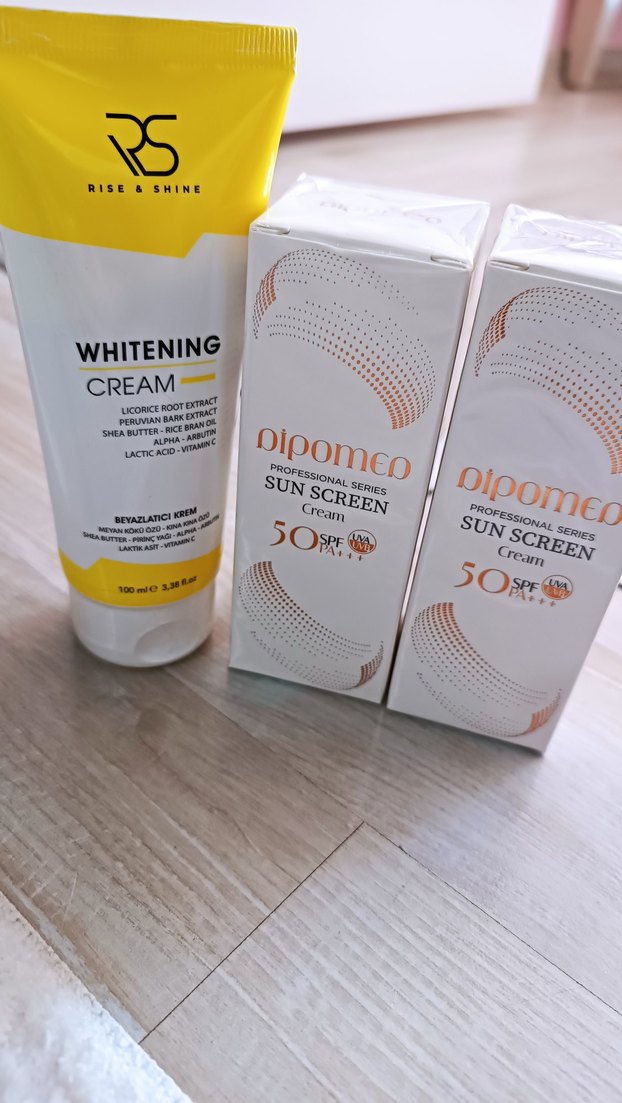 Lisans kökü özlü beyazlatıcı krem ve SPF 50 korumalı iki bipomeo güneş kremi içeren set, cilt koruması sağlar.