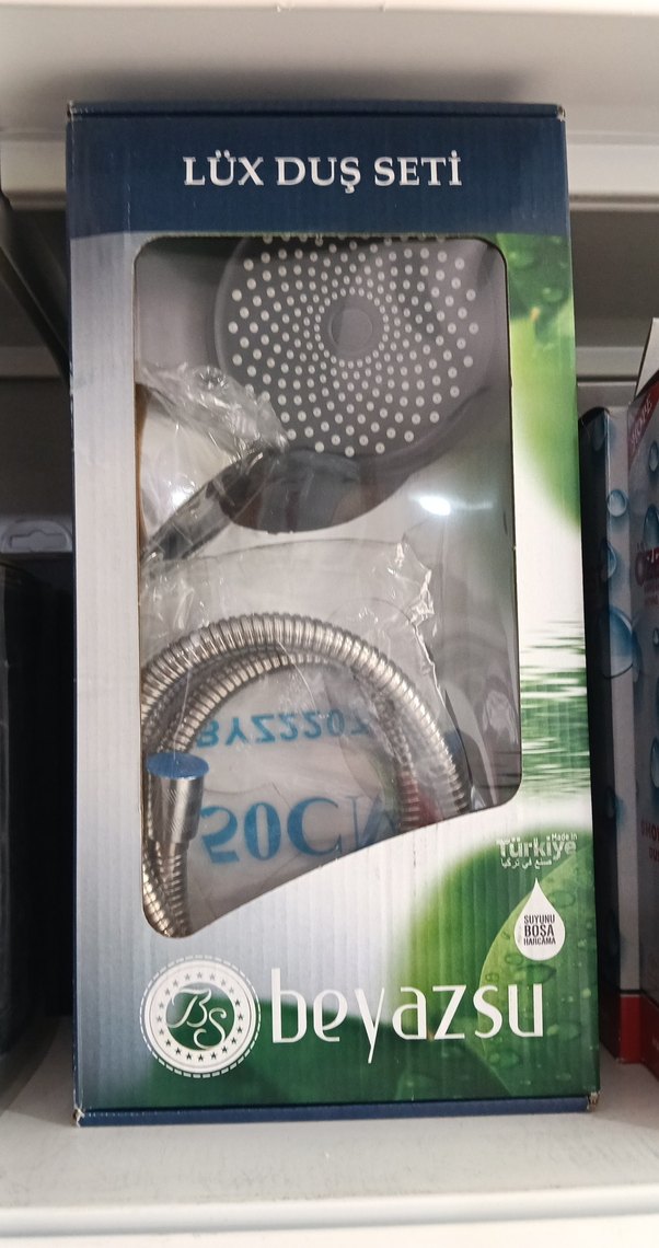 Beyazsu Lux duş seti, gri duş başlığı ve esnek mavi hortum içerir, kolay kurulum ve günlük kullanım sağlar.