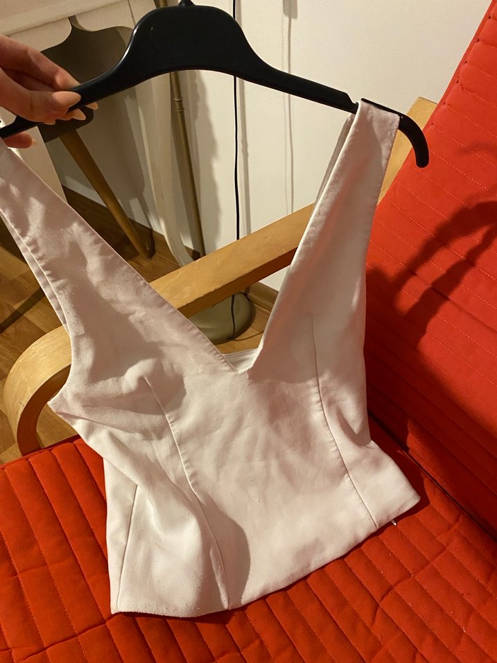 Beyaz, kolsuz, V yaka ve drapeli detaylı, kısa ve vücuda oturan mini bustiyer, sokak modasına uygun.Tiftiklenme mevcut göze batmıyor