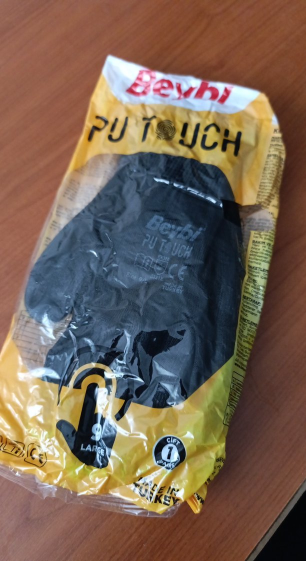 Beybi marka siyah baskılı fırın eldiveni, sıcak nesnelerle çalışırken koruma sağlar. Büyük boy ve 'PU TSUCH' yazılıdır.