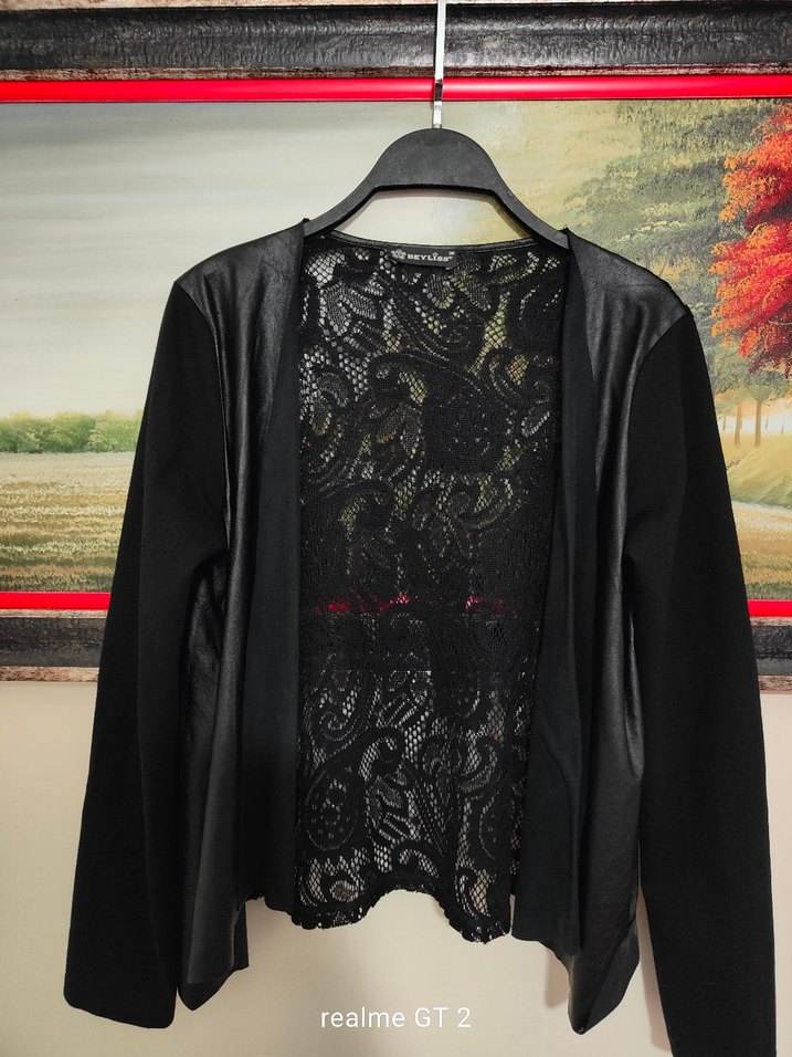 Dantel sırt detayı ve uzun kollu, straplez yakalı siyah deri goth tarzı önü açık kadın hırka bir iki kez giyildi yeni gibidir Beyliss marka