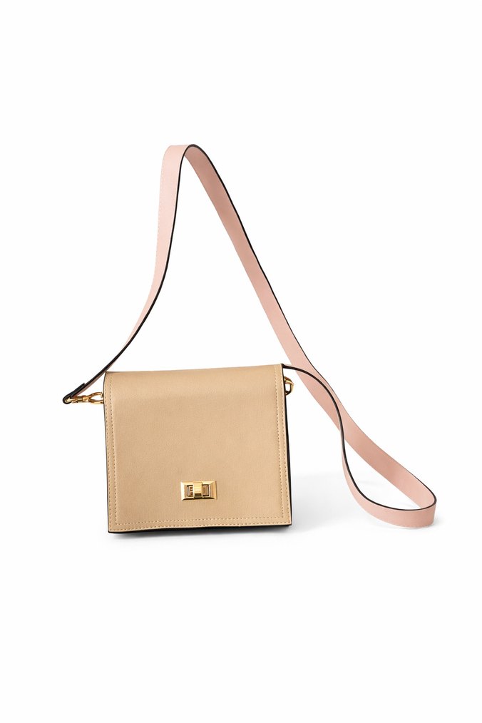 Orjinal sıfır ürün orijinallik kartı içindedir Bej deri kadın çantası, tokalı kapama ve pastel pembe askıya sahip, günlük kullanım için sade ve çağdaş tarzda.