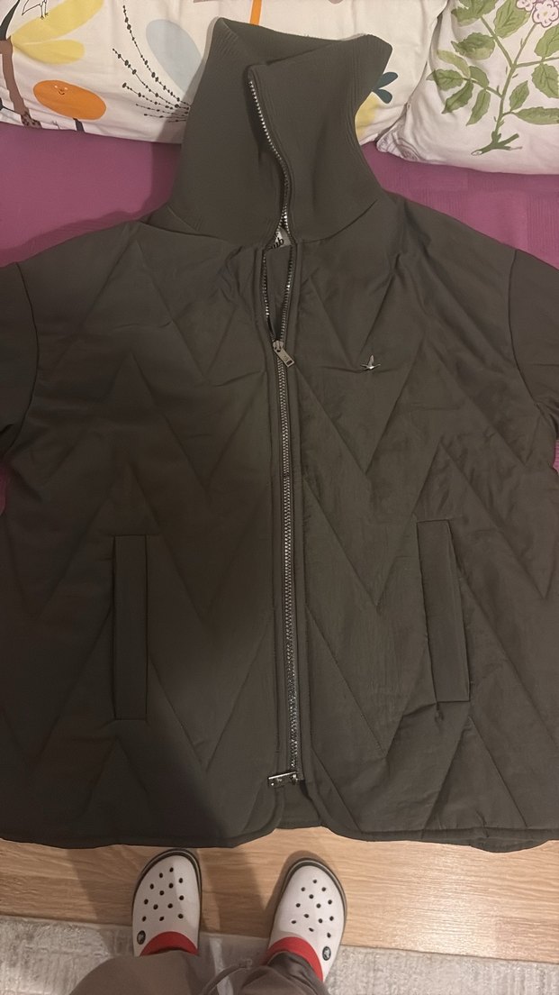 Haki renk yüksek yakalı ve fermuarlı kadın ceketi. Sentetik kumaştan, uzun kollu ve midi boyda, sokak stili ve athleisure için uygun.