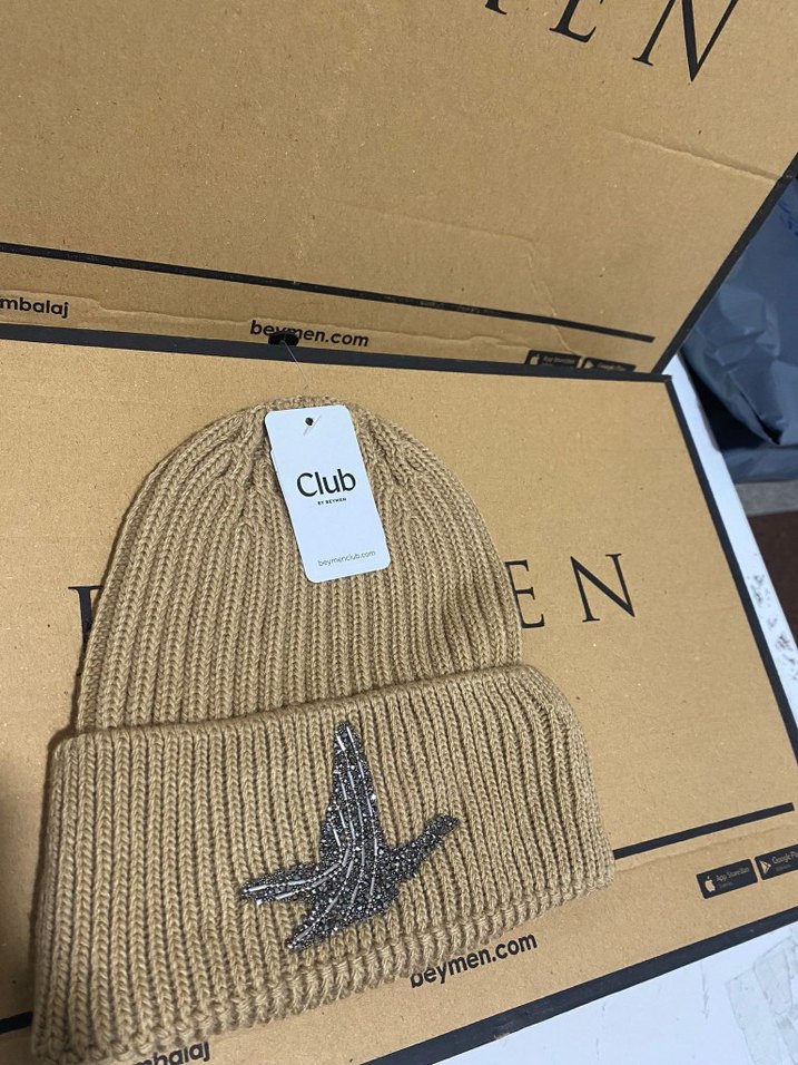 Bej renkli, örgü örnekli yün bere, rahat sokak stili ve manşetinde kuş işlemeli. Club etiketlidir.