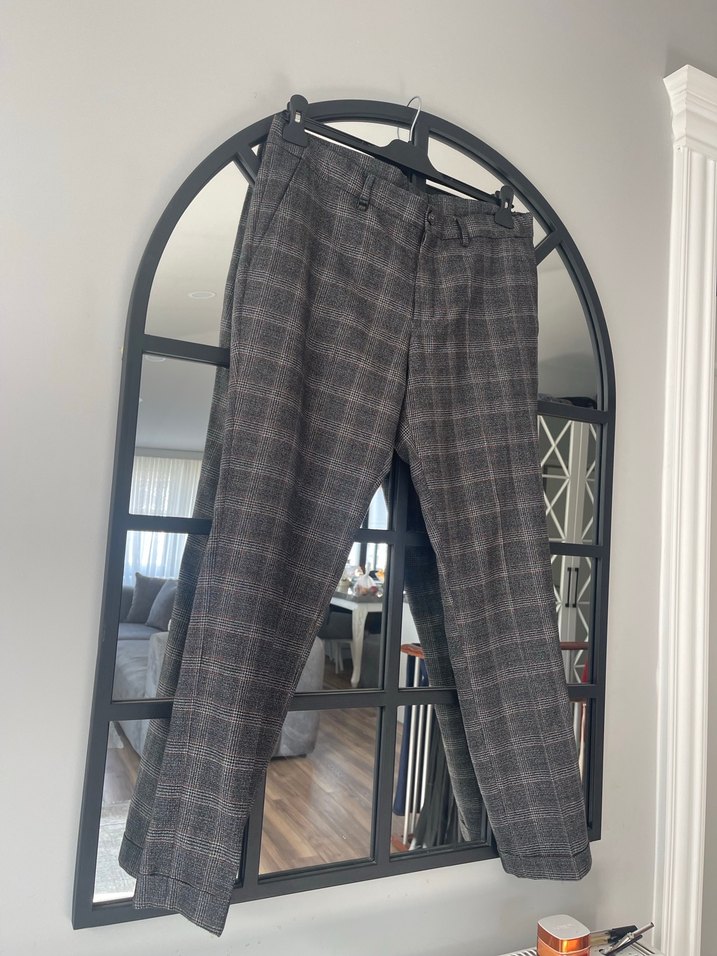 Gri kareli, normal boy 98 cm uzunlukta erkek kumaş pantolon. Üst kalite kumaştan, kemerli detaylı, ofis ve sokak tarzına uygun.bel 50 cm civarı çok şık İtalyan stil. 52 beden erkek .