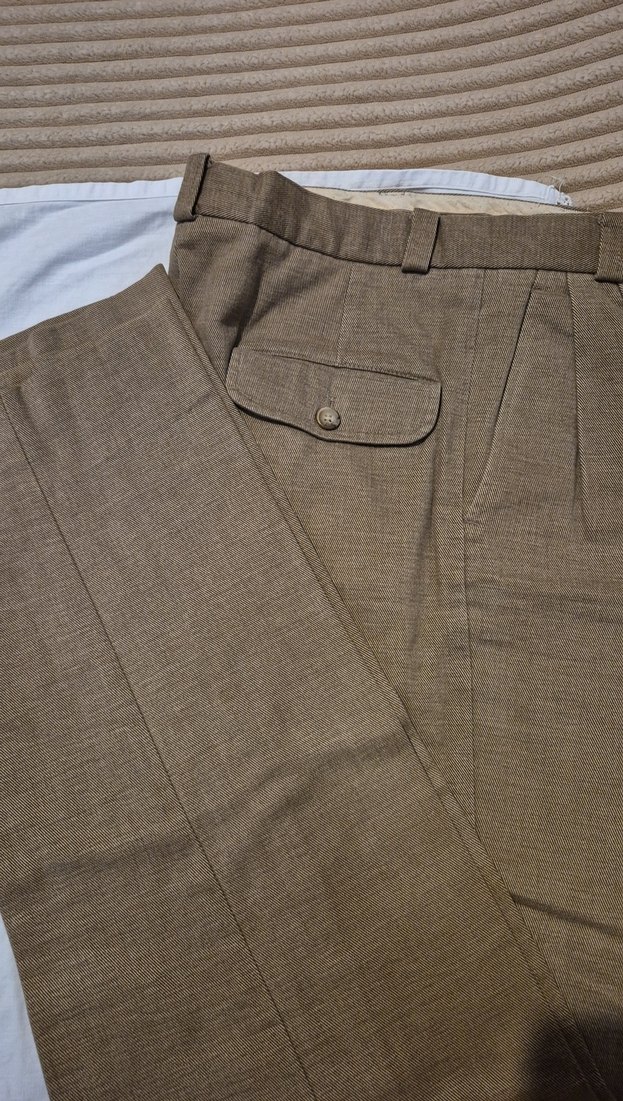 Koyu bej renk keten erkek pantolon. yüksek bel,pilili model. Ofis kullanımı için uygun, normal boyda ve desen içermeyen klasik tarzda.bacak boyu 110 cm