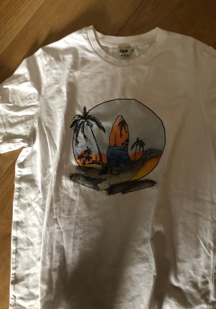 Pamuklu, beyaz renkli, bol kesim ve kısa kollu erkek tişörtü. Üzerinde palmiye ağaçları ve günbatımı baskısı bulunur. Rahat ve bohem tarz için uygundur.