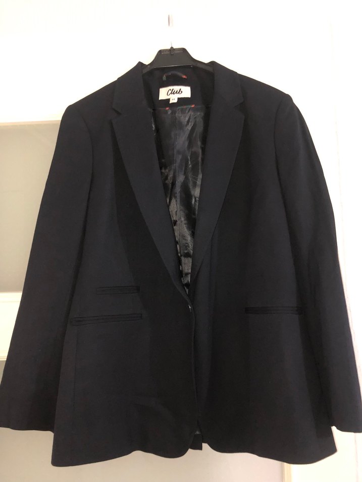 Lacivert renkte, düğmeli, normal boyda ve uzun kollu kadın blazeri. Notched yaka ve klasik kesimli, Beymen Club markalı ofis şıklığı için uygun.