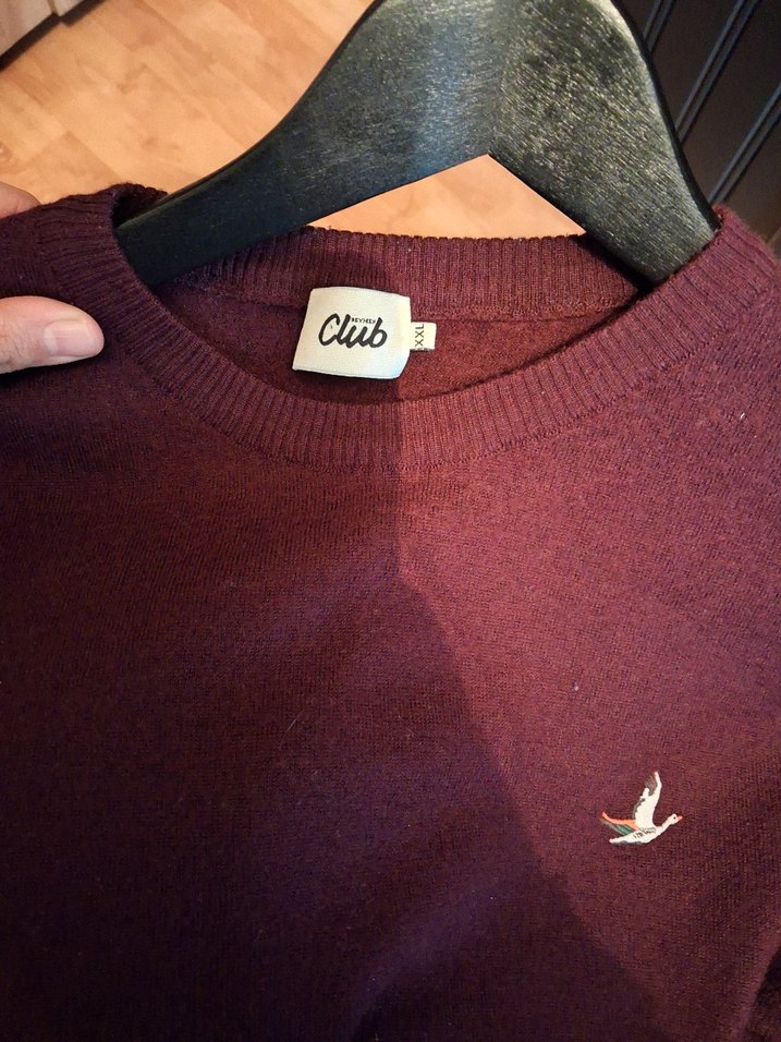 Bordo renkli erkek yün kazak, ince kesim, yuvarlak yaka ve uzun kolludur. Örgü dokusu ve küçük kuş nakışı vardır. Parlak rengiyle gündelik sokak stiline uygundur. Marka: Club.