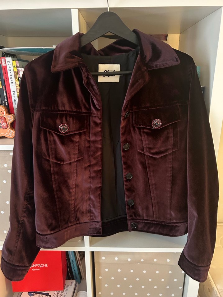 Bordo süet kumaştan yapılmış, düğmeli ve yakalı kadın ceket. Uzun kollu, bol kesim ve midi boyda, romantik buluşmalar için uygun.