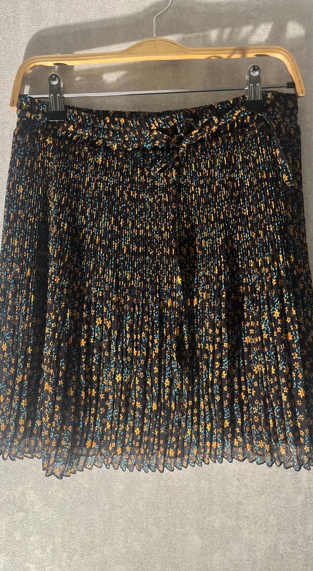 Bu pilili, desenli ve çok renkli midi etek, koyu sentetik kumaştan olup bohem tarzı için uygundur.