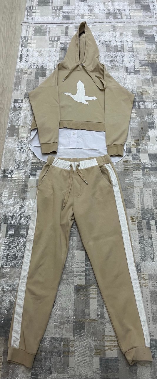 Bej renkte, uzun kollu, kemerli ve kuş desenli bol kesim kadın eşofman takımı. Beyaz yan şeritli pantolon ve notched lapel yakalı üstten oluşur. Ürün göründüğü gibidir