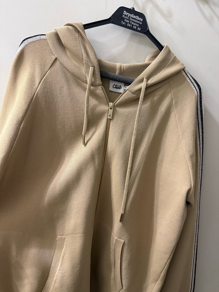 Bej kapüşonlu, fermuarlı sweatshirt, uzun kollu ve bol kesim. Kollarda gri şerit detaylarıyla günlük kullanıma uygun rahat bir model.