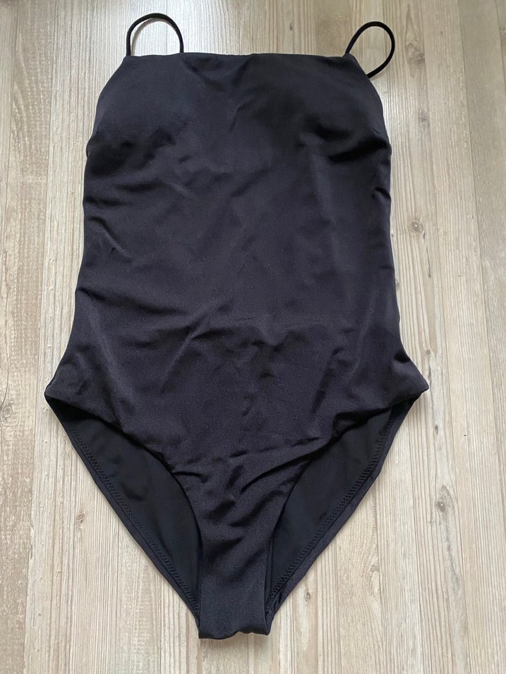 Siyah renkte, ince askılı ve düz tasarıma sahip, normal boyda kadın mayosu. Plajda rahat ve şık bir görünüm sunar. ️