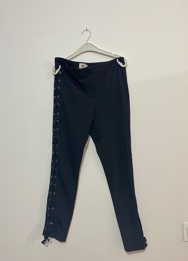 Skinny likralı siyah kumaş pantolon, bacakları sarıyor ve çok rahat. Yanlardaki bağcıklı işlemeler sadeliğine şıklık ve hareket katıyor. Çok yüksek bel değil, tayt gibi.