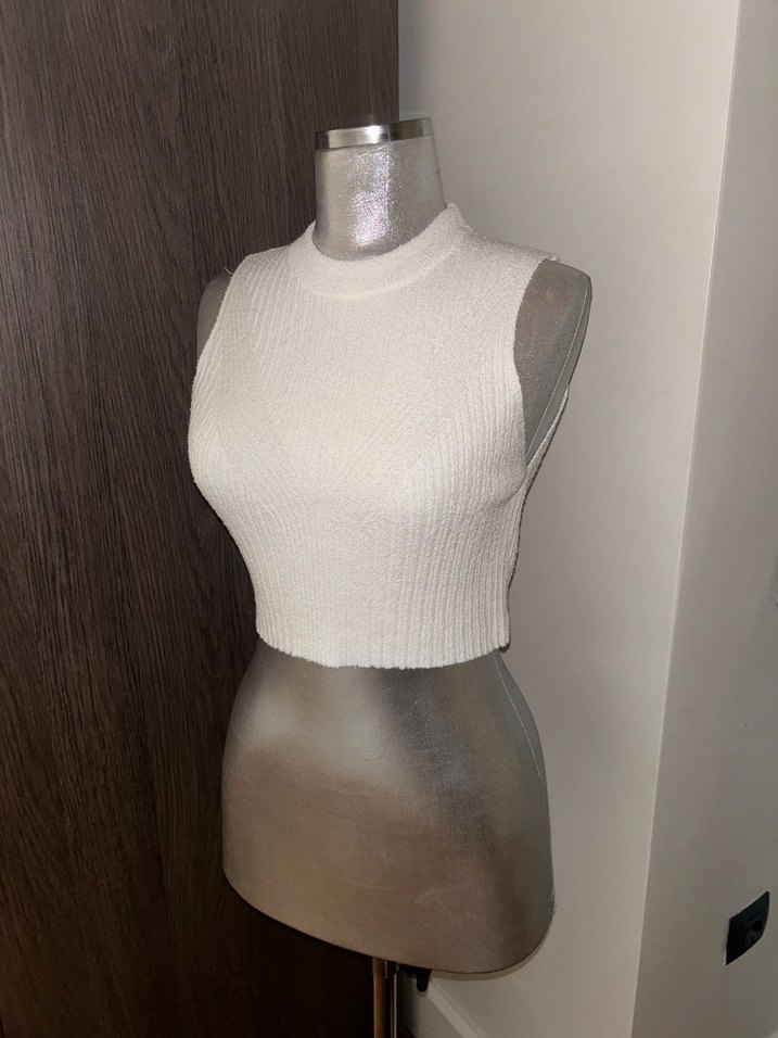 Yumuşak örgü kumaştan yapılmış, yüksek yakalı ve kolsuz beyaz crop top. S beden krem beyaz tonlarinda hafif dokulu yapisi hic kullanilmadi etiketli ve yeni tertemiz