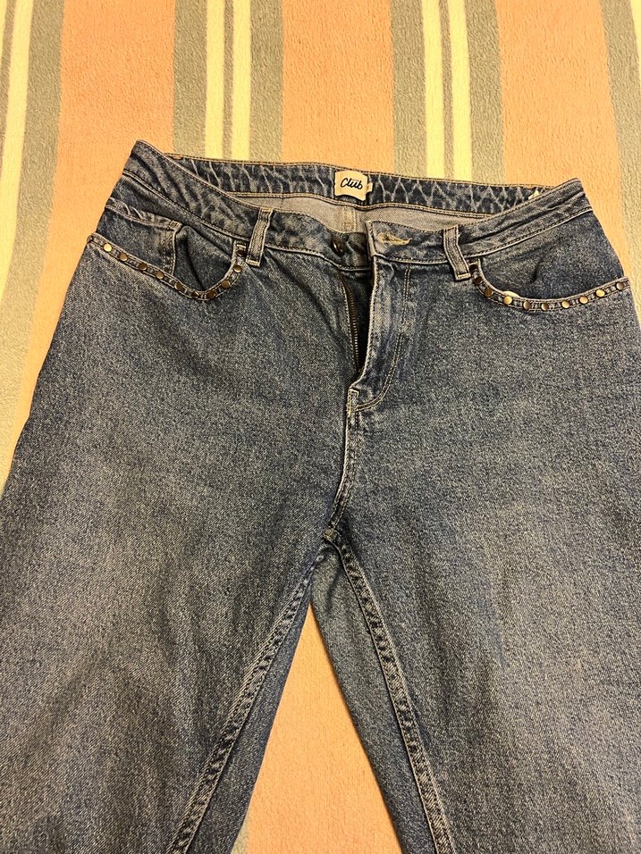 Koyu mavi renkte, beyazlatılmış, düğmeli ve ceplerinde çıtçıt detaylı, rahat kesim kadın kot pantolon. Günlük kullanım ve sokak modası için uygundur. Paçası püsküllü ve bilekte.