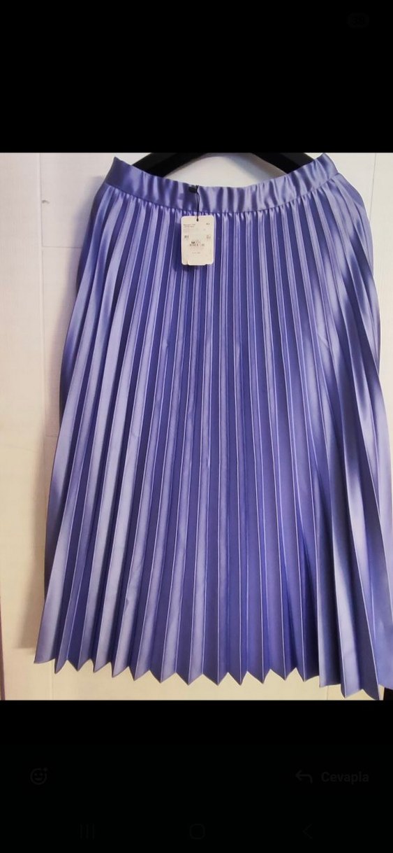 Mor renkte, pilili ve bol kesim uzun kadın eteği, yumuşak sentetik kumaştan üretilmiştir. Pastel tonuyla sokak modasına uygundur.