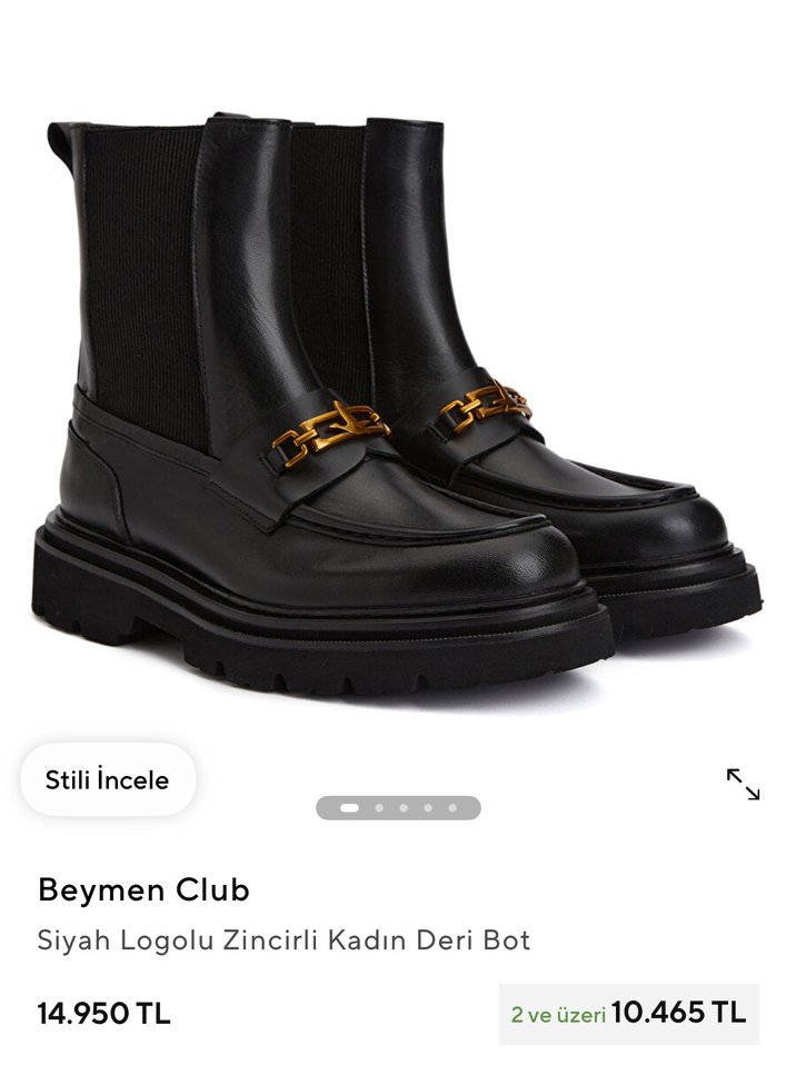 Beymen Club siyah deri kadın bot, zincir detaylı ve platform topuklu. Günlük kullanıma uygun, goth tarzı ve trend görünümlü.