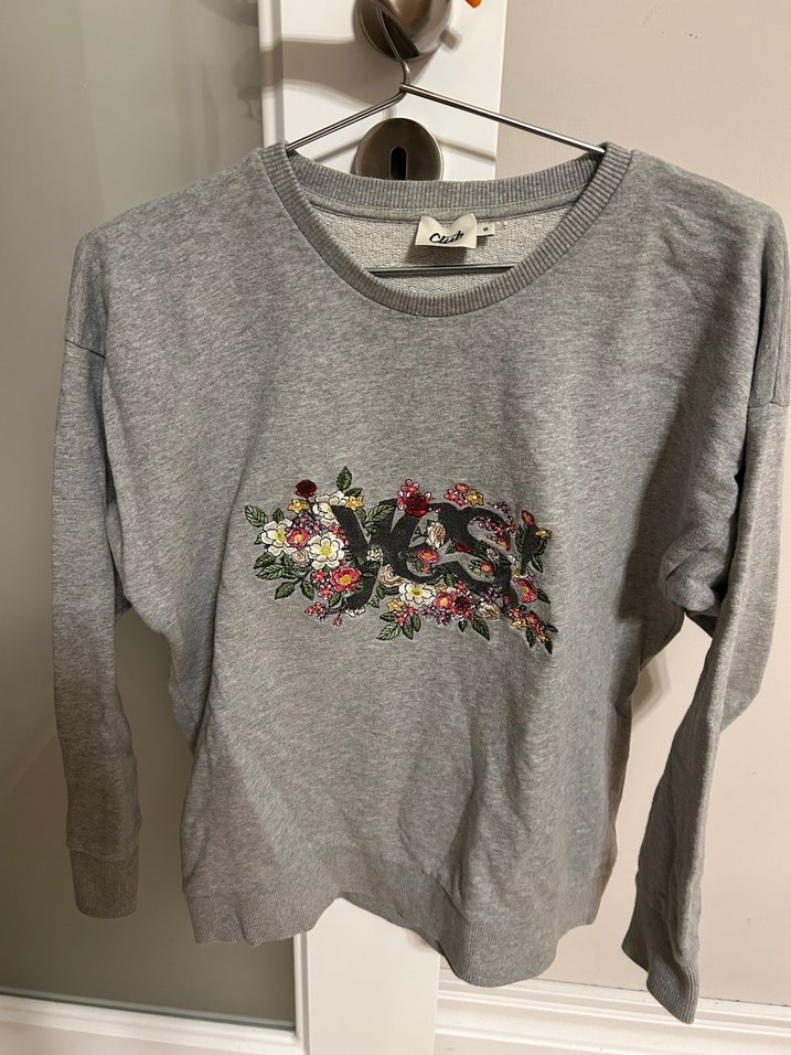 Gri pamuklu sweatshirt, yuvarlak yaka ve uzun kolludur. Bol kesimi ve önünde çiçek nakışı bulunan rahat sokak stili.