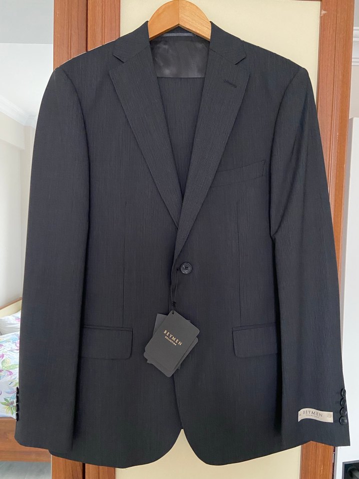 Bedeni olmadığı için satıyorum. Sıfır, etiketli, mağazadan nasıl alacaksanız o şekilde. Hiçbir terzi işlemi görmedi. 50/7 drop, slim, %73 yün %22 polyester %5 elestan. Çizgili desen, antrasit renk.
