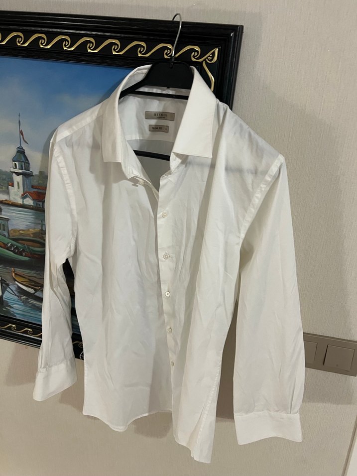 Erkekler için beyaz uzun kollu, yakalı ve düğmeli klasik gömlek. Pamuklu kumaştan, normal kesim ve uzunlukta, iş ve günlük kullanıma uygun.