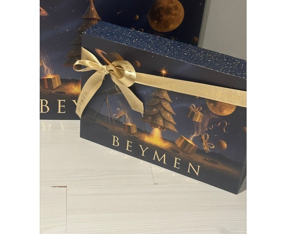 Beymen marka, koyu renkli ve altın kurdeleli şık hediye kutusu, özel anlar için uygun .