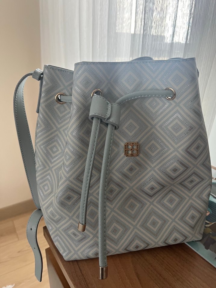 Soft mavi renkli, geometrik desenli kadın omuz çantası, tokalı ipli kapanışa sahip ve yumuşak sentetik kumaştan üretilmiştir. Çok az kullandım sıfırdan farksız çok tarz bir parçadır