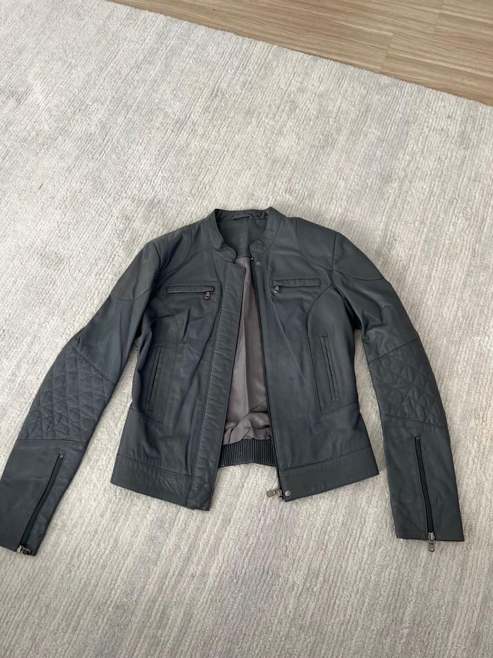 Gri kadın deri biker ceket, uzun kollu ve regular fit kesime sahip. Kemer detaylı, notched lapel yaka ve fermuarlı kapama bulunur. Günlük kullanıma uygundur. Gerçek deri.