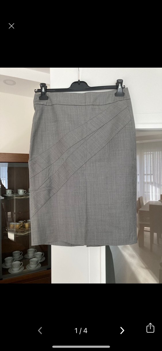 Gri midi kalem etek, kemerli ve çapraz dikiş detaylarına sahip çağdaş tasarım. Pürüzsüz sentetik kumaştan, ofis kullanımı için uygun. ✨