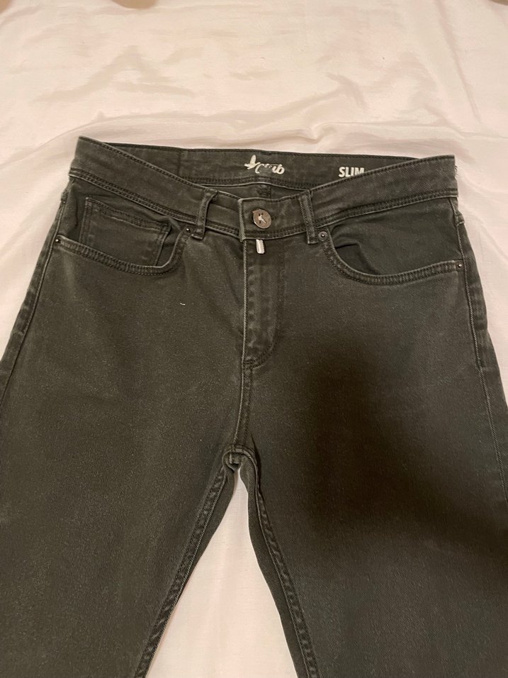 Haki renkte, slim fit kesime sahip erkek jean. Dayanıklı denim kumaştan.