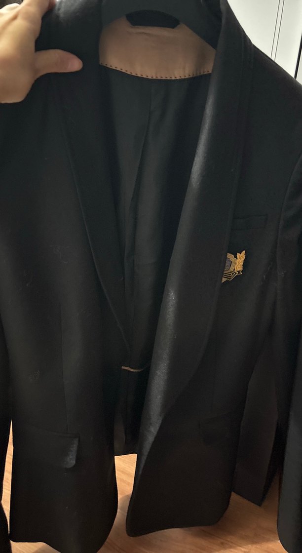 Düğmeli, koyu renkli notch yaka tuxedo ceketi. Uzun kollu, normal kesim ve göğüs cebinde küçük altın detay bulunur. İş ortamı için uygundur. ✨42 beden