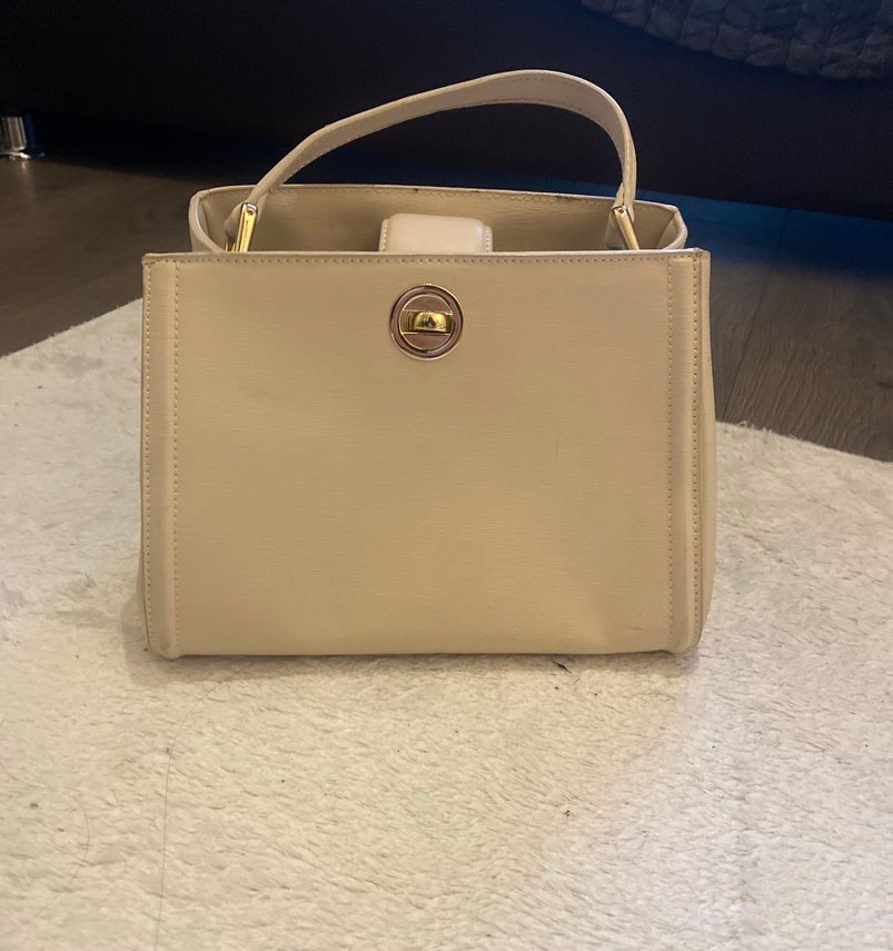 çanta, modern klasik tarzda ve tokalı kapanışa sahiptir. Desensiz pastel tonu günlük kullanıma uygundur. Belli belirsiz ufak bir lekesi var . 24x18 cm ebatinda