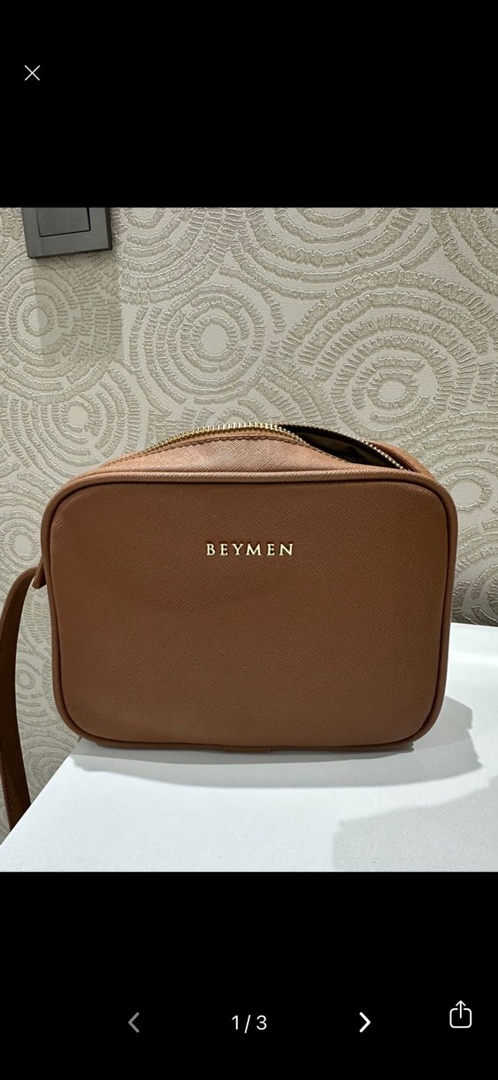 Beymen markalı kahverengi deri kadın çanta, kemerli ve desen içermeyen minimalist tasarıma sahiptir. Günlük kullanıma uygun, çağdaş ve trend bir görünüme sahiptir.