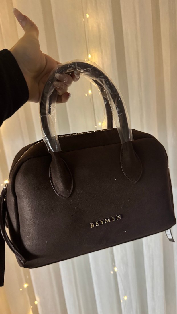 Beymen marka, kahverengi deri, tokalı saplı ve baskılı desenli kadın çantası, cesur iş stiline uygun günlük kullanım için.