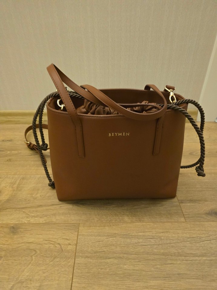 Beymen markalı, parlak kahverengi deriden yapılmış, kemerli tasarıma sahip kadın çantası. Trend sokak stili için uygun.