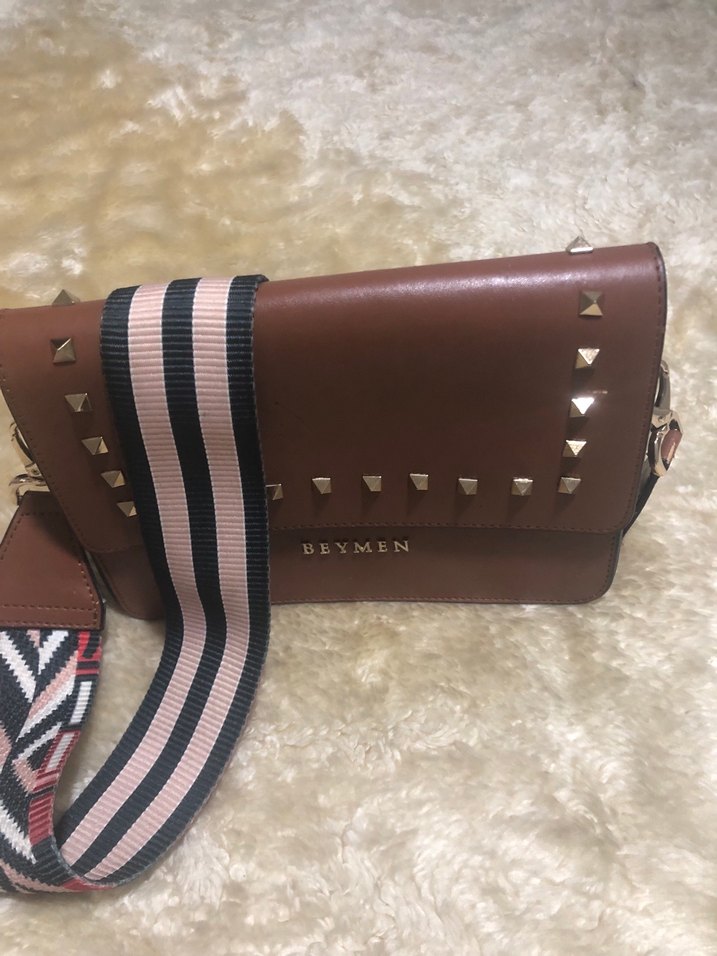 Beymen markalı kahverengi deri kadın çanta, perçin detaylı ve geniş çizgili kemer askılı, trend sokak stili için uygun.