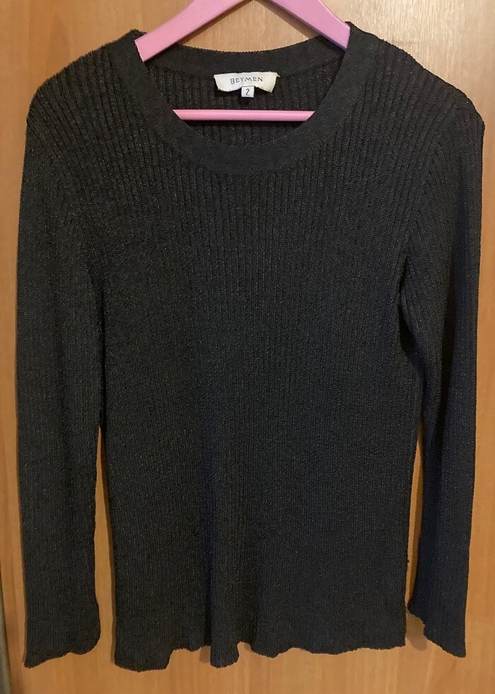 Merserize kazak. İç etiketini kesmişim. Dökümlü, simli bir yapısı vardır. Deformesizdir. S/M uyumludur.