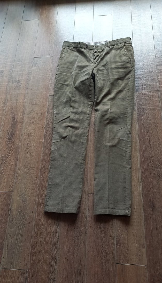 Kahverengi, kemerli ve normal boyda erkek pantolon, günlük kullanım için fitilli kumaştan üretilmiştir. 48 beden