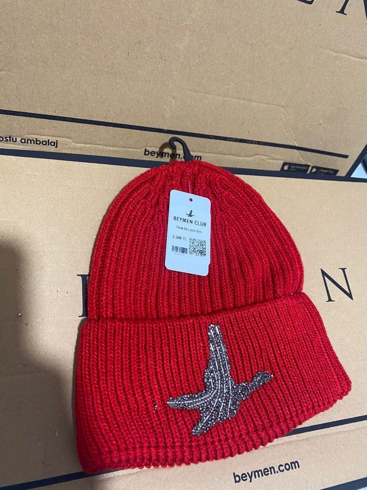 Kırmızı örgü kadın bere, katlanabilir manşet ve kuş işlemeli detay içerir. Yumuşak triko kumaştan yapılmıştır, trend sokak stiline uygundur.