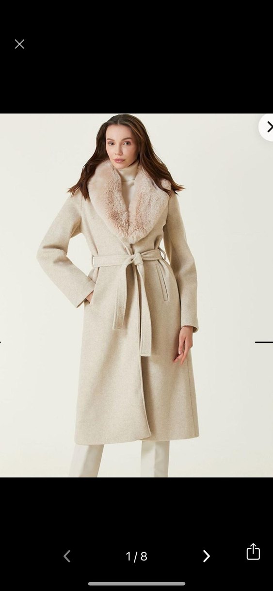 Kuşaklı ve yumuşak kürk yakalı krem renk kaban, şıklık ve sıcaklık sunar.
